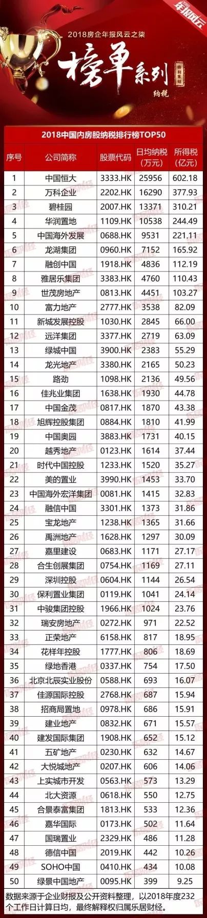 今天,乐居财经2018年报风云之榜单系列推出《2018中国内房股所得税排行榜TOP50》。