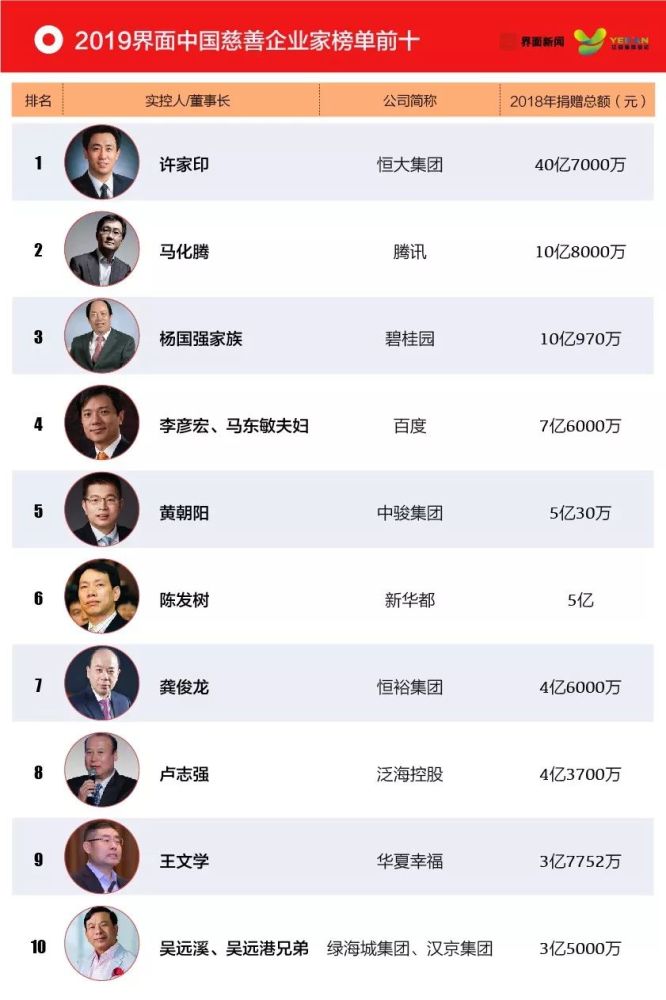 恒大集团董事局主席许家印则以40.70亿元捐赠额位居榜首,腾讯董事会主席马化腾以10.80亿元的捐款额排在第二。
