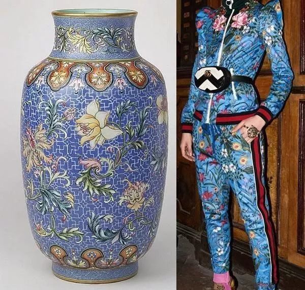 乾隆时期的粉彩折枝花卉纹灯笼瓶,摇身一变成为Gucci 17早秋海报上的新宠儿,莲花、牡丹、月季等纹饰错落有致地排布,栩栩如生。