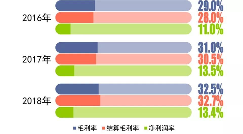 2018年,保利的利润水平持续向好,毛利率、结算毛利率、净利润率连续三年稳中有升。得益于结转项目价格上升,保利的毛利率及房地产结转毛利率分别同比提升1.5、2.2个百分点至32.5%、32.7%;净利润率为13.4%,基本与去年同期持平。