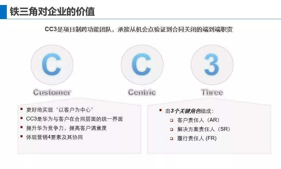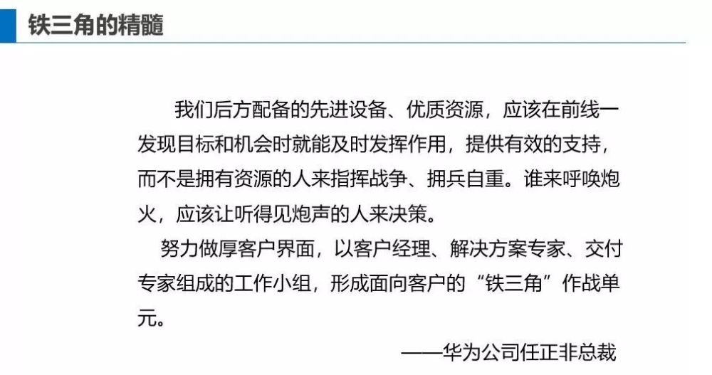 《向华为学习:铁三角组织与重大项目管理》这个课程是通过对业界标杆企业一线作战单元铁三角组织运作的研究,为企业破解业绩增长困局,提升客户满意度,提供实操性的方法论、流程、工具,并通过分享业界标杆企业销售项目管理的经验方法,为企业提升业绩增长打下坚实基础。