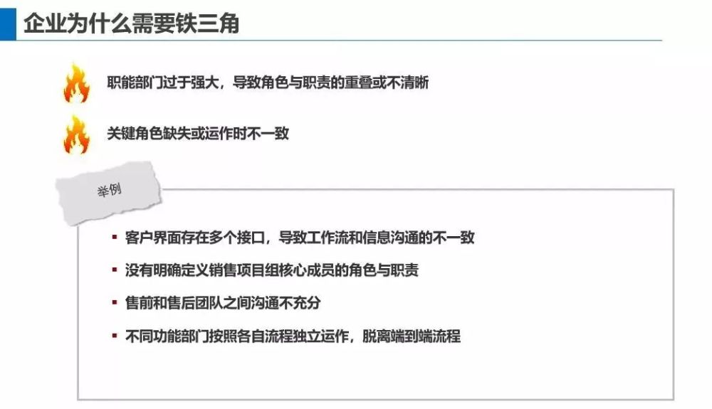 业界标杆企业铁三角组织发展历程以及为企业创造的价值,通过对市场体系业务流程的梳理,了解在商业机会的不同阶段,铁三角如何发挥独特价值,以及学习团队管理的方法、工具、日常运作,包含常用的工具如权力地图、痛苦链、泳道地图等在项目中的应用;