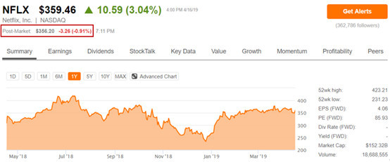 第一季度业绩发布后,Netflix股价在盘后小幅回调,截止发稿报356.2美元。