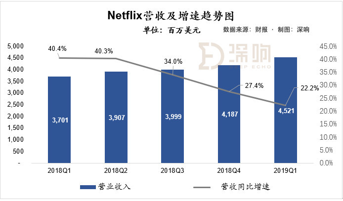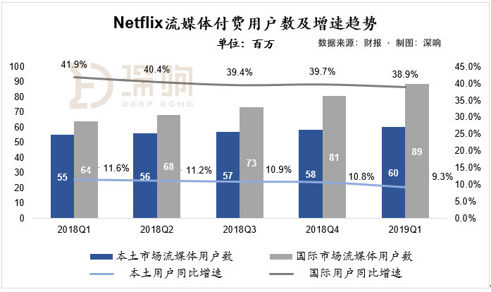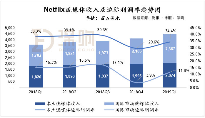 收入角度,2019年第一季度营收达到45.2亿美元,同比增长22.2%。其中,国际市场流媒体收入仍旧保持高速增长,达到23.7亿美元,同比增长32.8%;而美国本土流媒体业务增速持续放缓,仅为13.9%。