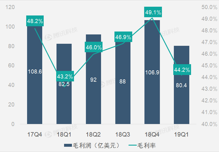 IBM第一季度的毛利润为80.4亿美元,较去年同期的82.5亿美元下滑2.5%;毛利率为44.2%,略高于去年同期的43.2%,但低于上一季度的49.1%。