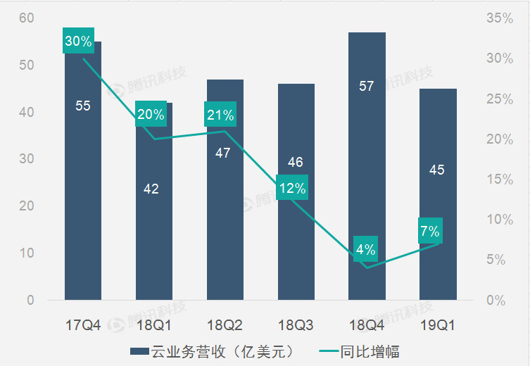 IBM第一季度的云业务营收为45亿美元,较去年同期的42亿美元增长7%,但低于上一季度的57亿美元。在经历了持续的下滑之后,IBM云业务营收增速实现反弹,高于上一季度的4%。