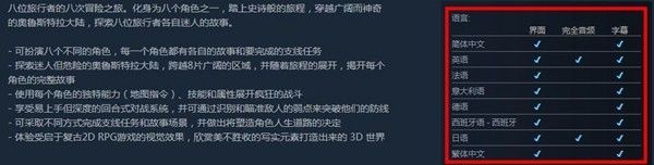 《八方旅人》已于2018年7月13日正式发售,登陆Switch平台,并将于2019年6月8日登陆PC平台,届时游戏将支持简体中文。