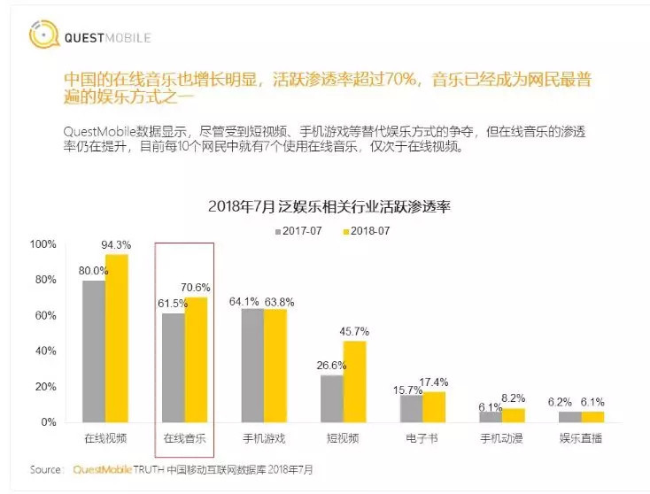 根据Questmoboile发布的《中国移动互联网在线音乐报告》,对比2017年在线音乐活跃渗透率为61.5%,2018年在线音乐增长迅速,渗透率达到了70.6%——每10个网民中就有7个使用在线音乐,仅次于在线视频。