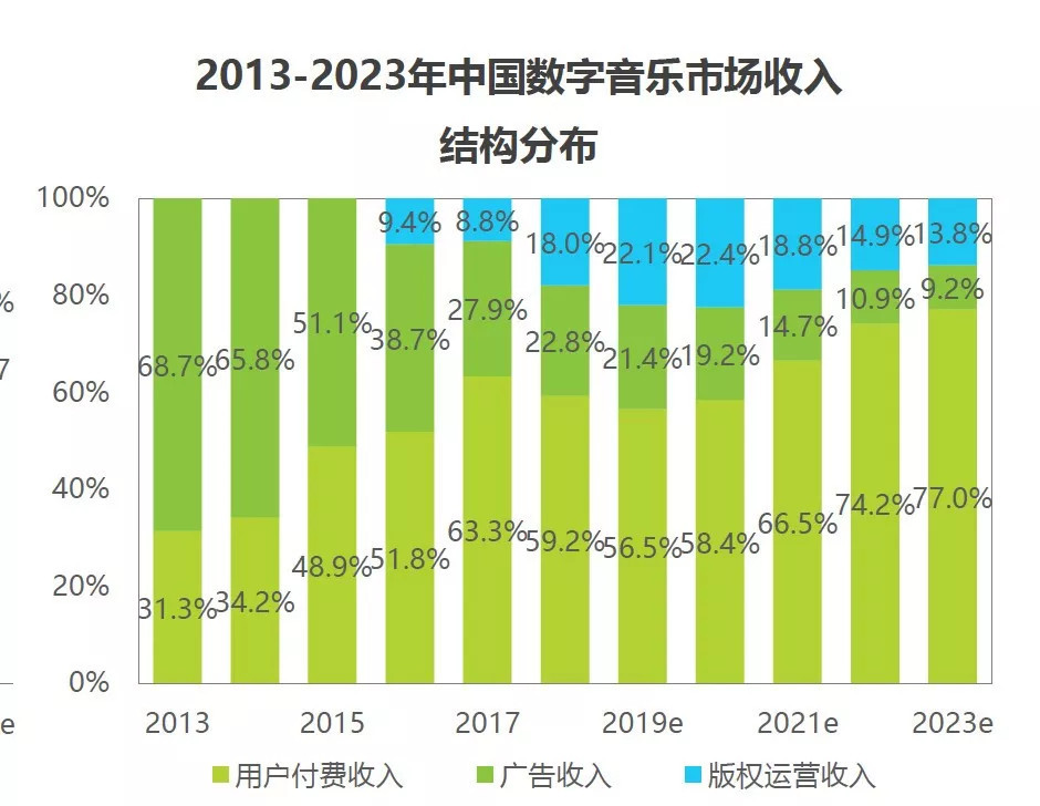 从中国数字音乐平台的整体收入构成上来看,其收入主要来源于用户付费、广告收入和版权运营等三个方面。