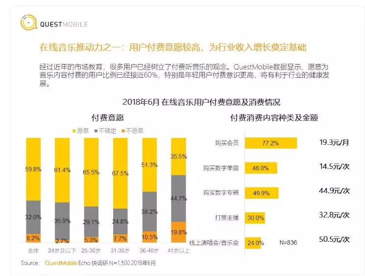 根据Questmobile的调研,我国在线音乐用户付费意愿较高,整体付费意愿接近6成。尤其是35岁以下群体,付费意愿均高达60%以上。