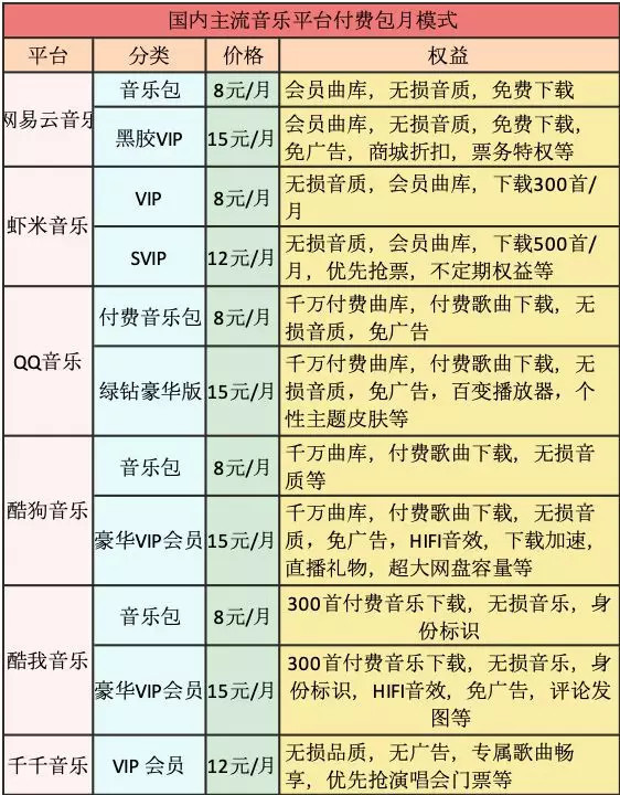 目前,国内主流音乐平台均推出了音乐包和VIP等为主的付费订阅制度,以区分普通用户。其中,8元级别的音乐包与15元(12元)级别的超级VIP用户的差异,主要集中在于音乐相关的增值服务。
