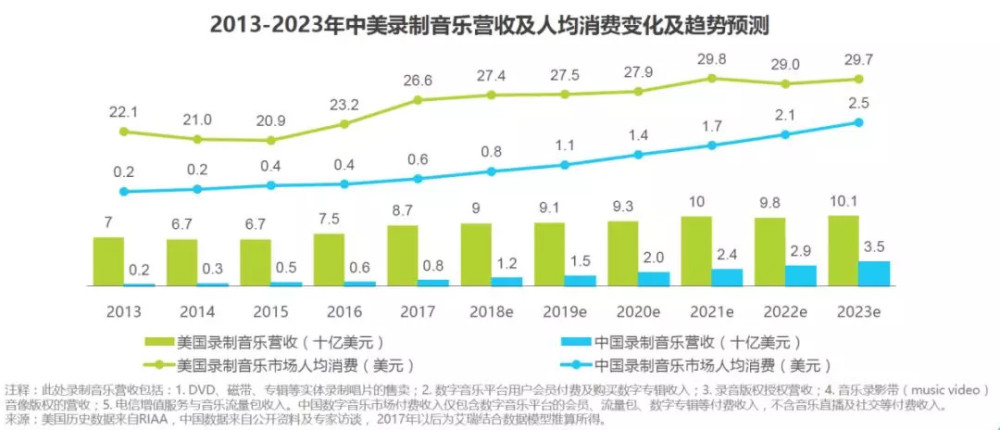 ?与成熟的美国市场相比,中国音乐相关市场仍处于起步阶段。数据显示,2018年美国录制音乐营收预计达到9亿美元,而同年中国录制音乐营收仅为1.2亿美元。但从增长情况来看,中国的音乐产业处于持续增长阶段。