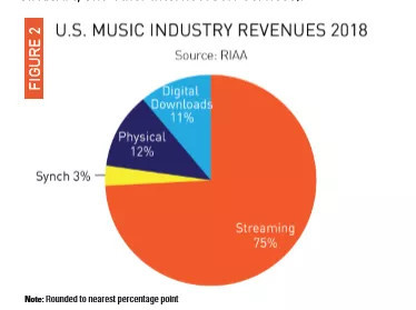 根据美国唱片业协会2019年发行的报告,2018年,美国的数字音乐在整个音乐产业市市场中占比86%(数字下载11%+流媒体75%)。