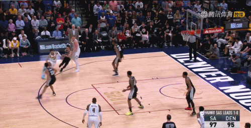 掘金继续采取犯规战术,伦纳德两罚全中,穆雷战术跑位兜到弧顶位置接到队友发球,面对双人防守拔地而起三分再中!