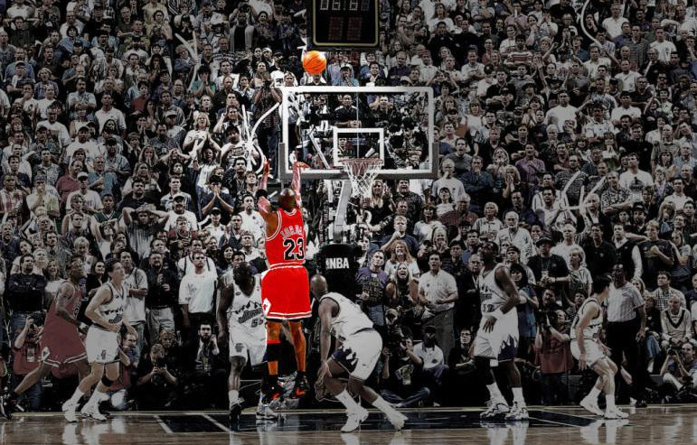 就在这样的情况下,乔丹打了44分钟,得到了45分占全队总得分(87分)的52%。终场前40秒,斯托克顿投篮命中让爵士领先3分。菲尔-杰克逊叫了暂停,他安排了两个战术,第一个是暂停结束后马上要打的,第二个则是打进一球后若是防守成功需要执行的进攻套路。