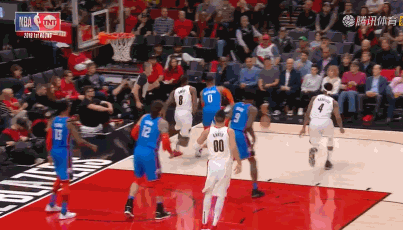 当利拉德完成进攻后,镜头还没来得及切换到场上,韦少就发动闪电战,助攻弗格森上演空接暴扣。