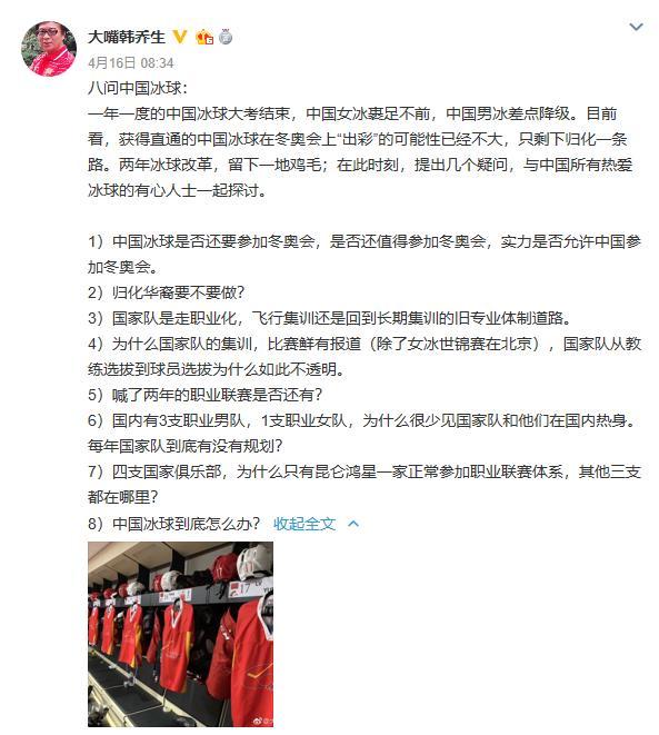 北京时间4月16日,著名体育解说员韩乔生在微博发文,8个问题严厉质问中国冰球究竟该如何发展,受到网友们的关注。4月16日,2019年国际冰联女子冰球世锦赛甲级B组在京落幕,两胜三负积6分位列第四堪堪保级。为了筹备2022年的北京冬奥会,国家在冰雪项目上的动作并不小,目前的成绩并不足以交差,才会有韩乔生的质问。