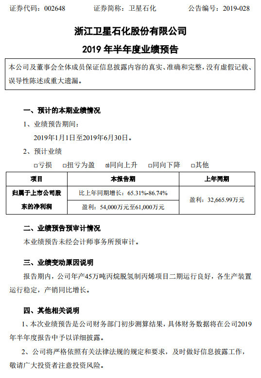 两市首份中报预告出炉:卫星石化预计实现净利5.4亿