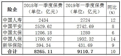 随着中国平安一季度保费的出炉,A股五大上市险企一季度的保费全部面世。据《每日经济新闻》记者统计显示,一季度五家上市险企合计实现保费收入9110.7亿元,同比增长10%。