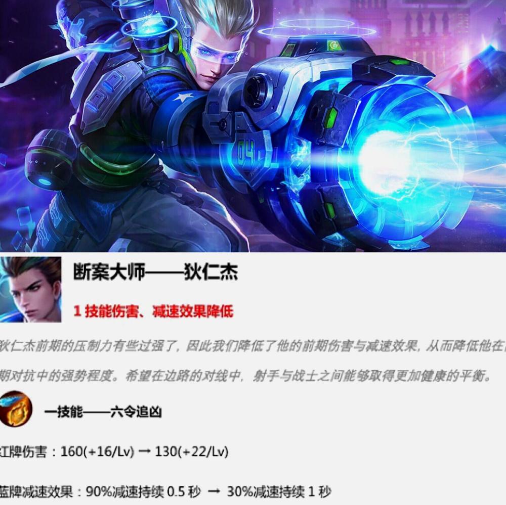 狄仁杰虽没有位移,但是他二技能有同等净化效果,毫不畏惧带控制的刺客战士。为了游戏平衡,官方还是决定削弱狄仁杰。降低狄仁杰的红牌伤害,这让狄仁杰前期势力明显减弱。蓝牌控制效果较少60%,持续时间增加0.5秒。