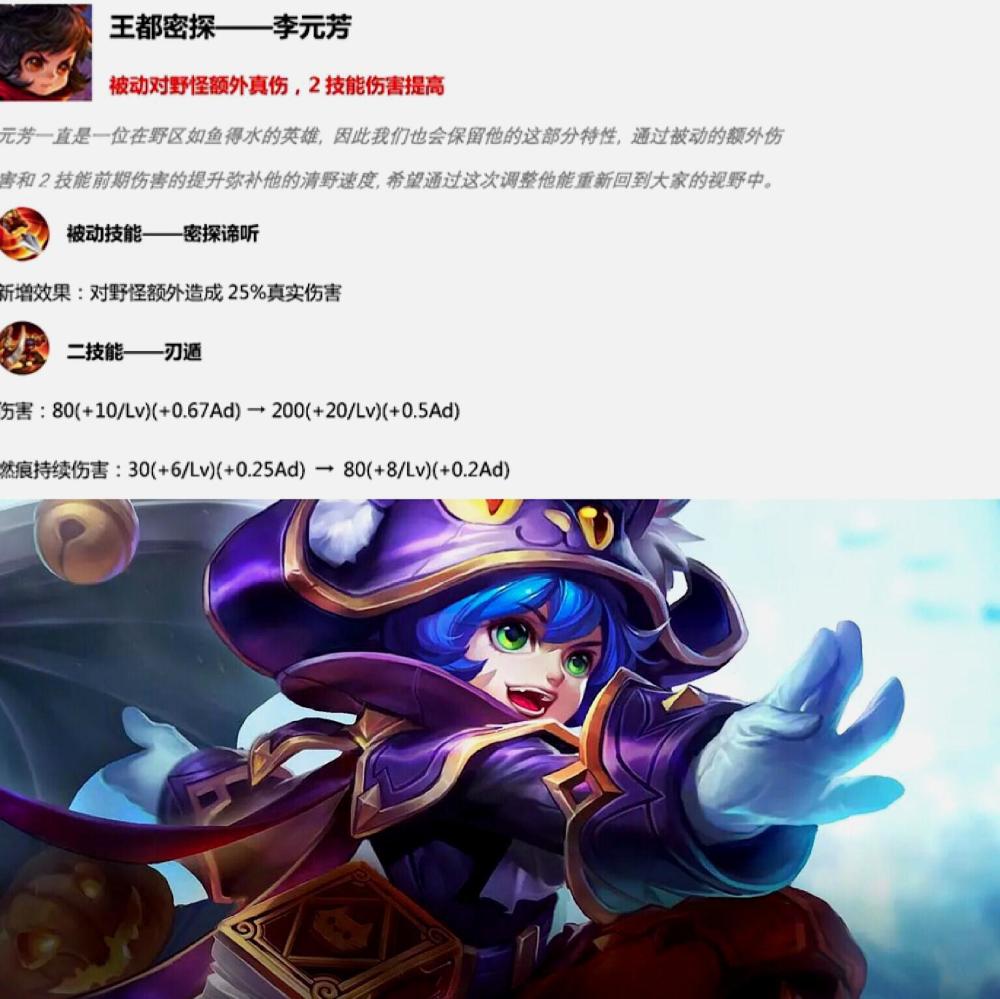 李元芳曾经在kpl赛场上都是走打野位,官方这次对李元芳走打野位进行调整。被动新增效果可以对野怪额外造成25%的真实伤害,二技能伤害大幅度提高。这次调整能让李元芳打野更有效率,二技能的伤害提高也能让李元芳在前期抓人更稳定。