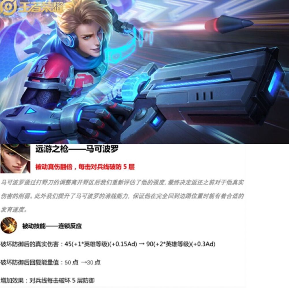 马可波罗在前面几个赛季都不是很出色,出场率很低。如今到了S15赛季,官方终于对马可波罗进行加强。首先是马可波罗的被动真实伤害翻倍,每击对兵线破防5星。可以看出提高了马可波罗的清线效率,让他更能适应边路。