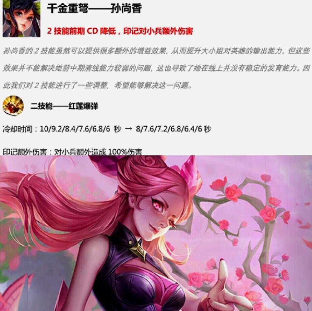 孙尚香爆发伤害在所有射手里都属于数一数二,那么这次调整是否能让孙尚香重回射手一姐呢?孙尚香的二技能前期CD降低,但是印记额外对小兵造成100%伤害。可以看出孙尚香走边路清线速度大幅度提高,更有利于发育。