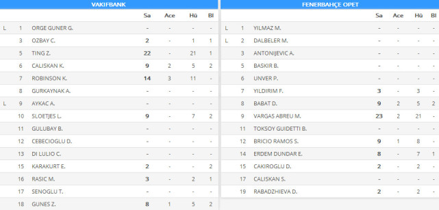 本场比赛,瓦基弗银行两人得分上双,朱婷拿到全队最高的22分,其中扣球21分,拦网1分,罗宾逊14分,阿克曼和斯洛特耶斯9分,居内什8分,替补亮相的拉西奇和卡拉库尔特分别得到3分和2分;费内巴切瓦尔加斯23分,布里西奥和巴巴特均得到9分,艾达8分。