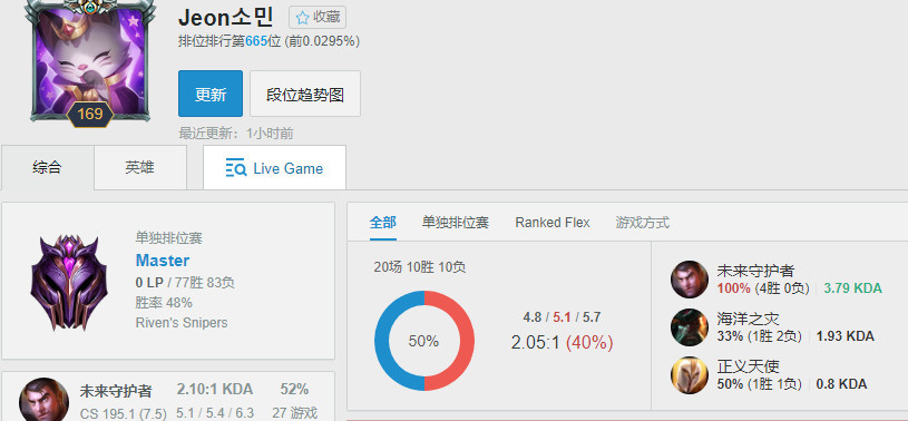 功夫不负有心人,凌晨RNG姿态六连胜上大师,目前姿态身处LOL韩服大师组0胜点,排在LOL韩服第665位,近20场比赛的KDA为4.8-5.1-5.7,胜率五成,出场率最高的上单英雄是版本强势的杰斯,胜率高达100%,未尝一败。