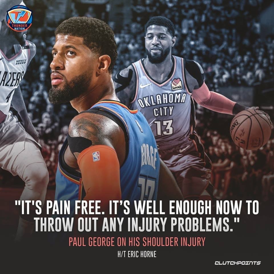 先说保罗-乔治,他在2月27日对阵掘金的比赛中撞伤了右侧肩部,随后他轮休了三场比赛复出,雷霆在赛季末的赛程难度大,没有乔治雷霆很难保住西部前八的席位,最终乔治决定带伤作战,乔治受伤前后的表现差距相当的明显尤其是在中远距离投篮命中率上,乔治本人也表示肩伤影响了自己的投篮手感,而后在3月14日跟篮网的比赛中乔治的左肩也遭遇撞伤出现肿胀,但他还是带上作战,从常规赛开始到2月25日,乔治的三分命中率达到40.6%,而2月27日后,乔治三分命中率下降到33.8%,G2的赛前乔治的肩部绑着厚厚的冰袋,他说道肩部已经没有酸痛感,他应该能找回手感,最终只有7中2的三分球,看上去并没有恢复手感,两场季后赛三分球22中6。