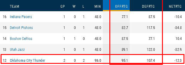 雷霆这两场比赛最大的问题仍旧是进攻,两场比赛雷霆三分球61中10,命中率只有可怜的16.3%,利拉德一人就有19投9中,命中率47.3%,雷霆首战只拿下99分,次战只有94分,进攻效率95.1联盟第12,防守效率107.4联盟第七,而他们引以为傲的防守杀招也消失不见,开拓者首战104分,次战114分,并没有太受到雷霆的防守影响,利拉德与麦科勒姆两人,利拉德两战59分,麦科勒姆两战57分,很明显雷霆的优势荡然无存,劣势愈加严重,雷霆队要想完成这2-0的逆转已经相当的困难,而且雷霆在2016年夏凯文-杜兰特离开俄城后也已经陷入了首轮魔咒。