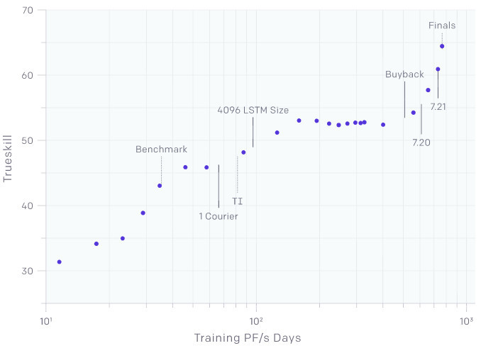 OpenAI Five的TrueSkill。因为我们已经应用了额外的训练计算,其中线条划分了主要的系统变化(转向单一通道;将LSTM大小增加到4096单位;升级到补丁版本7.20和7.21)。该图大致是线性的,这意味着OpenAI Five从额外的计算中不断受益(注意这是一个双对数图,因为x轴是计算量的对数,而TrueSkill大致对应于指数进展)。这个图表评估了最终游戏规则(1个通道,补丁7.21等)上的所有机器人——甚至那些在旧游戏规则上训练过的机器人。任何这些之后的陡坡表明OpenAI Five适应了这种变化; 根据变化,评估可能对之前的版本不公平。