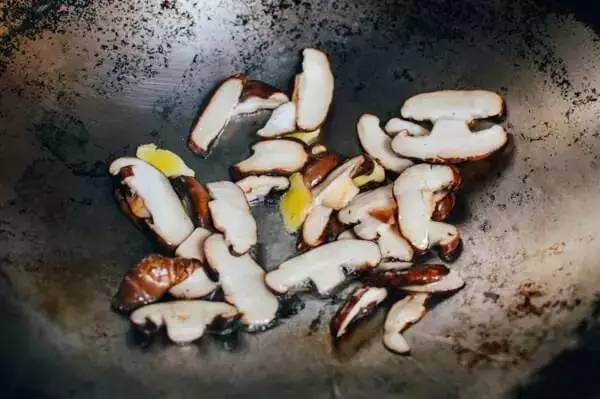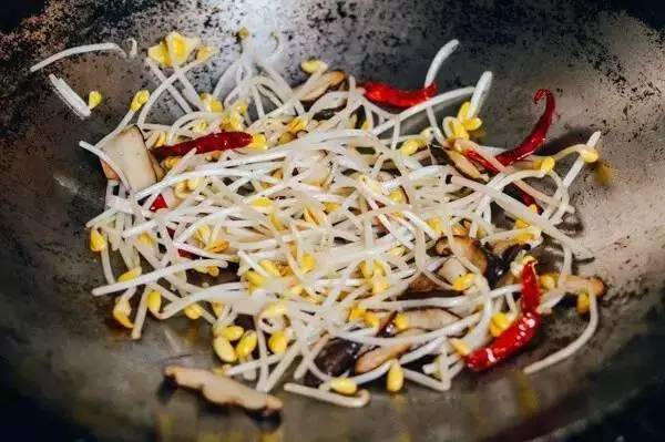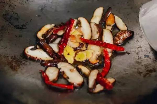 2.姜蒜爆锅,下香菇翻炒,然后加入干辣椒、豆芽一起翻炒。