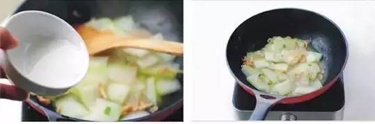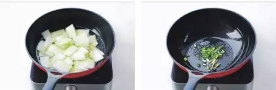 2.先把冬瓜炒至八分熟后捞出,这一步一定不要用水焯!不然冬瓜的营养会流失。