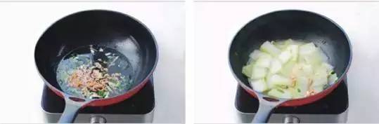 3.葱姜蒜爆锅,下虾米翻炒,再放入冬瓜片一起翻炒。