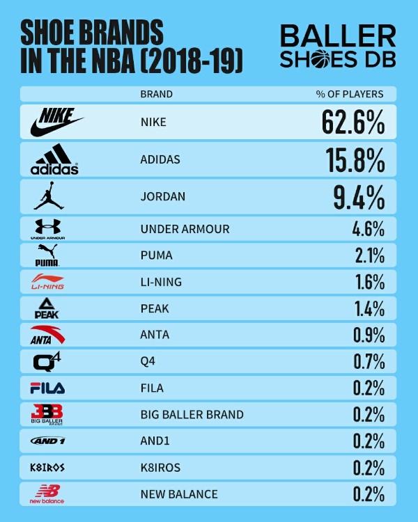近日,BallerShoesDB发布一份各大运动品牌在NBA联盟的占比榜单,在很大程度上反映出整体市场情况,主流品牌数量超过10家。
