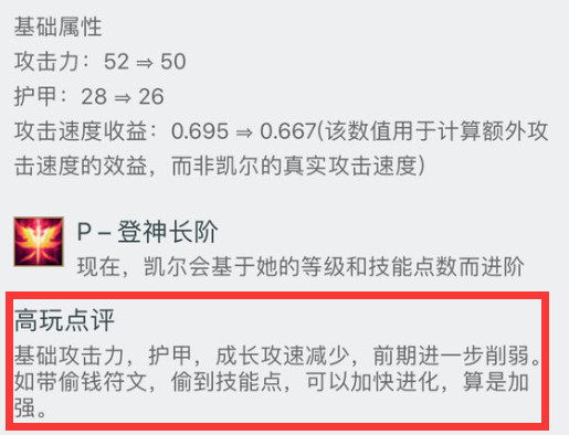 虽然“高玩点评”表示这个版本的凯尔“算是加强”,但事实上并非如此,前期攻击力、护甲和攻速比率的小幅削弱,让她的对线能力有所下滑。最重要的是,现在凯尔的被动进化是取决于自身等级和技能点数,这意味着即使你是欧皇偷了2个技能合剂,也无法完成提前进化了。这个改动对偷钱流凯尔还是有很大的影响,不过,凯尔没有更好的基石符文,在启迪系其他符文没有削弱之前,行窃预兆应该还是主要的打法。在连续经过了几个版本的削弱后,凯尔目前的前期作战能力更弱了,变成了一个前后期强度明显差异的英雄。