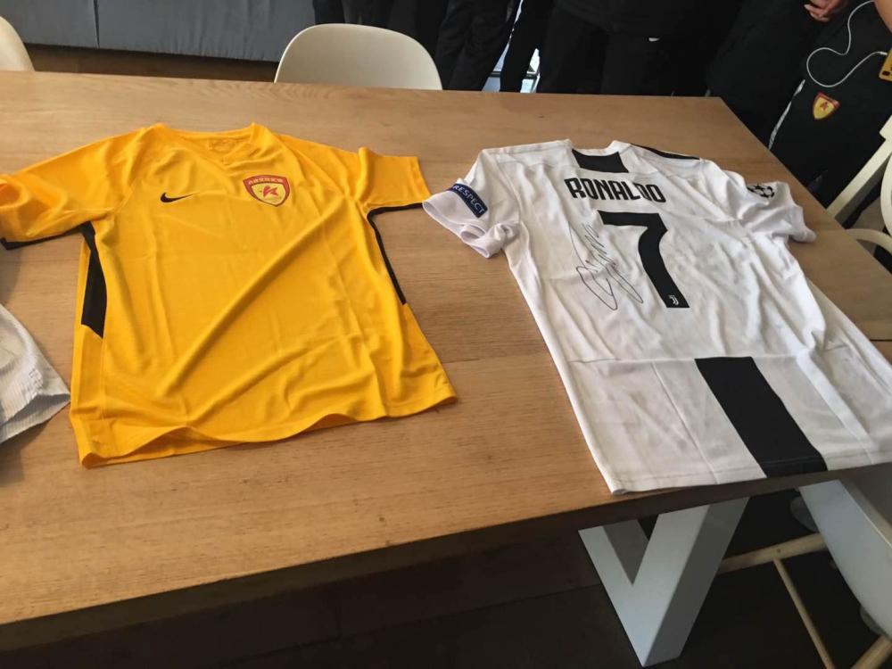 当小球员们走入客厅的时候,惊喜的发现奥维马斯带回来的C罗签名球衣以及奥维马斯当时滑行庆祝时的衬衫都摆在桌子上,这件见证了历史的衬衣甚至还没有来得及洗。星辉宏弛的球员们将俱乐部的球衣赠送给奥维马斯,而这件球衣也得以与C罗的球衣、奥维马斯的衬衣并排摆在了一起,小球员们则与球衣一起合影,对他们来说,这显然是难以忘记的一天。