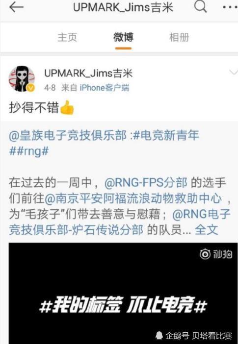 最近因为是LPL休赛期,所以比赛的热度也不是很高,反而是战队的节奏一波接着一波。最近RNG俱乐部又遇到了一件事情。大家都知道,这段时间RNG一直在各大高校做宣传演讲,虽然春季赛成绩不是很好,但是战队的运营还是很不错的,去各大搞笑的演讲也受到了很高的欢迎,然而就是这个校园演讲的宣传片,被网友扒出是抄袭了QGhappy王者荣耀战队,并且原作者也出来认证了。