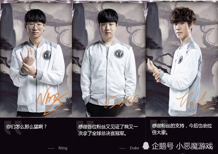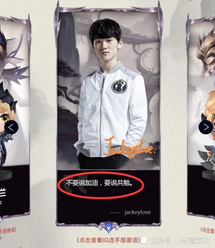 在掌盟上,IG冠军手办推广的页面上还有每位选手的感谢语,都是选手的一些常见的梗。如宁王在队内语音的那句“他怎么那么猛啊”用在了此处,Duke和Theshy两人的感谢语同样都是在玩梗。不过在jackeylove的感谢语上,却带了一波Uzi的节奏。