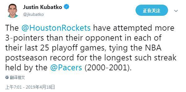 火箭上一次在季后赛三分出手次数少于对方还是2017年4月26日,当时火箭三分37投6中,雷霆38投10中。从那以后,火箭在季后赛的三分出手数必超对手。