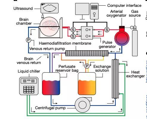 按照论文的描述,美国耶鲁大学学者领衔的团队开发了一个名为BrainEx的血液循环模拟系统,在猪死亡4小时后,将充满氧气、营养物质和保护性化学制剂的血液替代品通过BrainEx系统注入分离出来的猪脑。