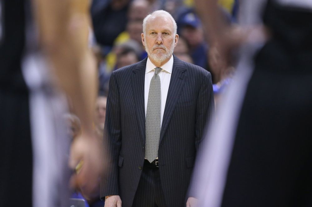 坐在最靠前的桌子一旁的,是马刺队的主教练格雷格-波波维奇,他的身旁还有着一扇窗户,可以欣赏到加州首府街道上的美景。