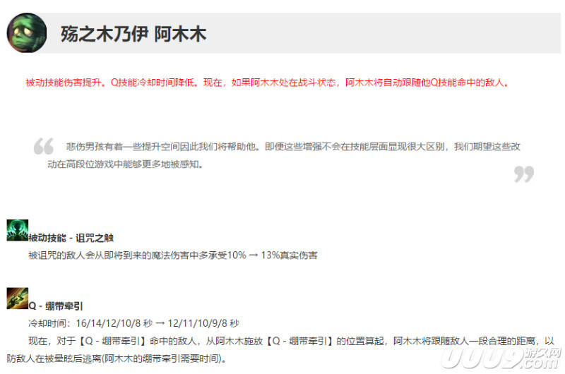 而在9.8版本的改动中,这个被动技能得到了进一步的加强!由计算魔抗前伤害的10%,变为计算魔抗前伤害的13%,这个改动能给进一步提升阿木木的伤害能力。加上Q技能前期CD的减少,使得阿木木前期能给通过Q技能在线上不断的找机会。