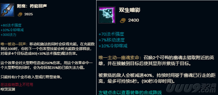 阿木木的Q技能需要一定的预判,事先减速了敌人也能提高Q技能的命中率。并且最关键的是双生暗影能很好的知道附近有没有敌人在反蹲,阿木木虽然一身控制且伤害能力也不错,但只有一套技能是阿木木的硬伤,如果被对手反蹲,鹿死谁手还不好说,双生暗影能很好的避免这种情况的发生。如果前期打顺了后面就可以继续补充法强装备,甚至补出来帽子强化伤害能力,而如果前期节奏没有起来,后面装备出肉装,阿木木在后期也能发挥很好的功能性。