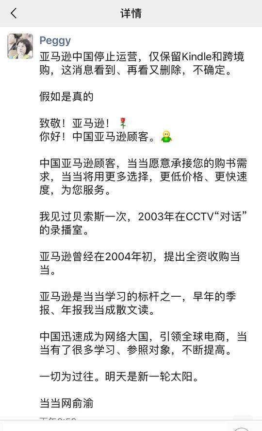 俞渝在个人朋友圈还向中国亚马逊顾客温情喊话,当当愿意承接您的购书需求,当当将用更多选择、更低价格、更快速度、为您服务。