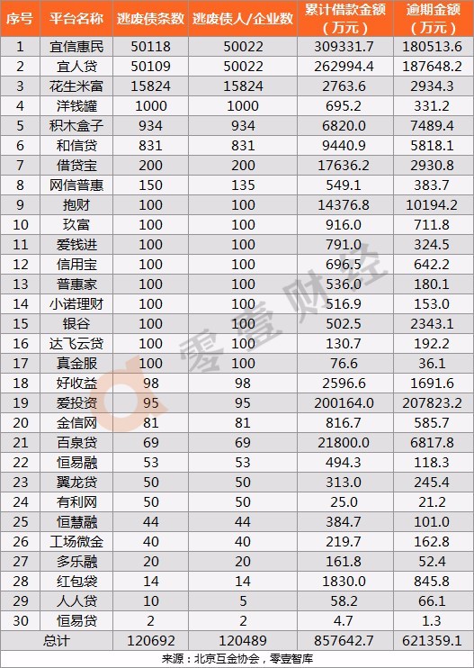 据零壹智库统计,截至4月18日,协会公布的逃废债信息已有120692条,共涉及30家P2P平台,累计借款金额为85.7亿元,逾期金额(本息)共62.1亿元。而在3月1日,协会公布第二批名单的时候,仅有16家会员单位公布了2311条逃废债信息。一个多月的时间里,增加了近12万条逃废债记录。