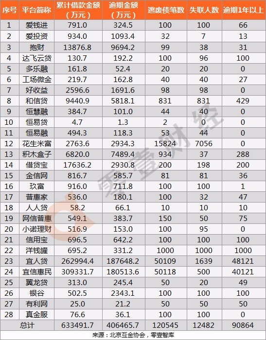 其中宜信惠民和宜人贷的逃废债人(或企业)数量均高达50022,逾期金额达18亿元以上。