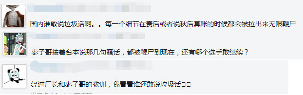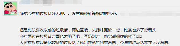 有网友指出比较喜欢以前的垃圾话,两边互喷,火药味更浓一点,比赛也多了点看头。今年两边在垃圾话方面也太弱了吧,互奶对方,感觉都很虚的样子。