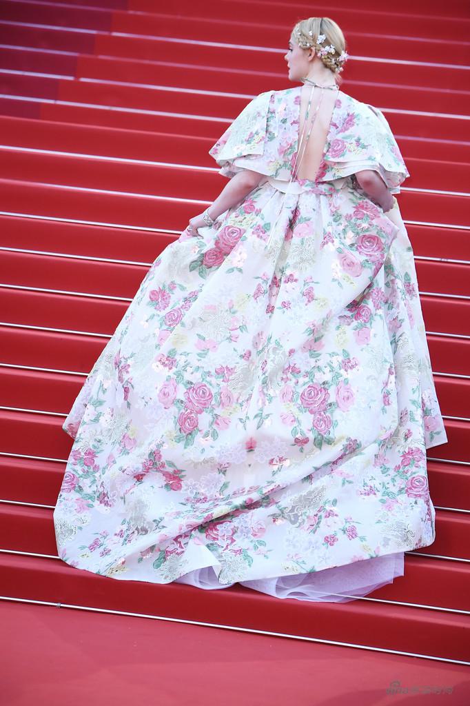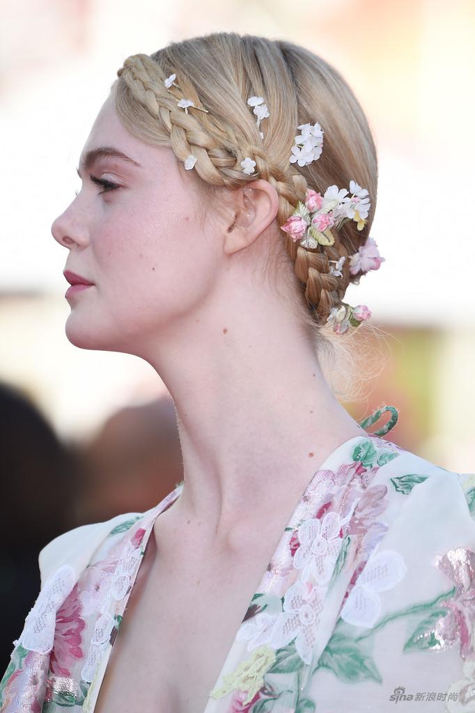 评委Elle Fanning今晚化身乡村风花姑娘亮相戛纳红毯,Valentino2019春夏高定礼服大片印花搭配性感深V,居然给人很清新的感觉,麻花辫搭配清新的小花朵,宛若花仙子。Elle Fanning身上的少女感真的无敌了。